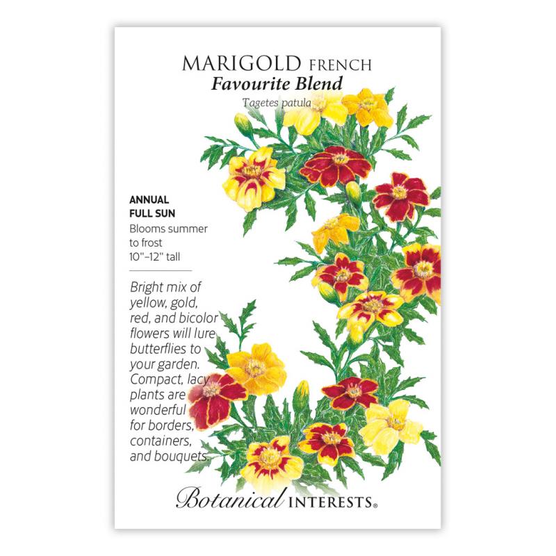 | These bright marigolds call in pollinators big and small. Flowers with a single row of petals make pollen access easy. Compact plants are tidy and full; beautiful at the front of a bed or tucked between vegetables. Plants grow and flower quickly with continuous blooms from spring until frost. French marigolds are edible, but with a very strong flavor similar to its pungent scent. Fairly drought tolerant once established. |