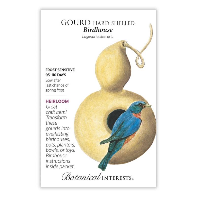 | Once properly cured, hard-shelled gourds, such as 'Birdhouse', can last for decades and can be painted, carved, cut, or drilled as you would do with wood, for hundreds of craft projects. 'Birdhouse' gourd of course makes a great birdhouse—leave natural or paint any color you want. Grow 10'–16' vines on the ground or up a very sturdy trellis to produce mature gourds in 80 to 140 days. Also attracts hummingbirds! |