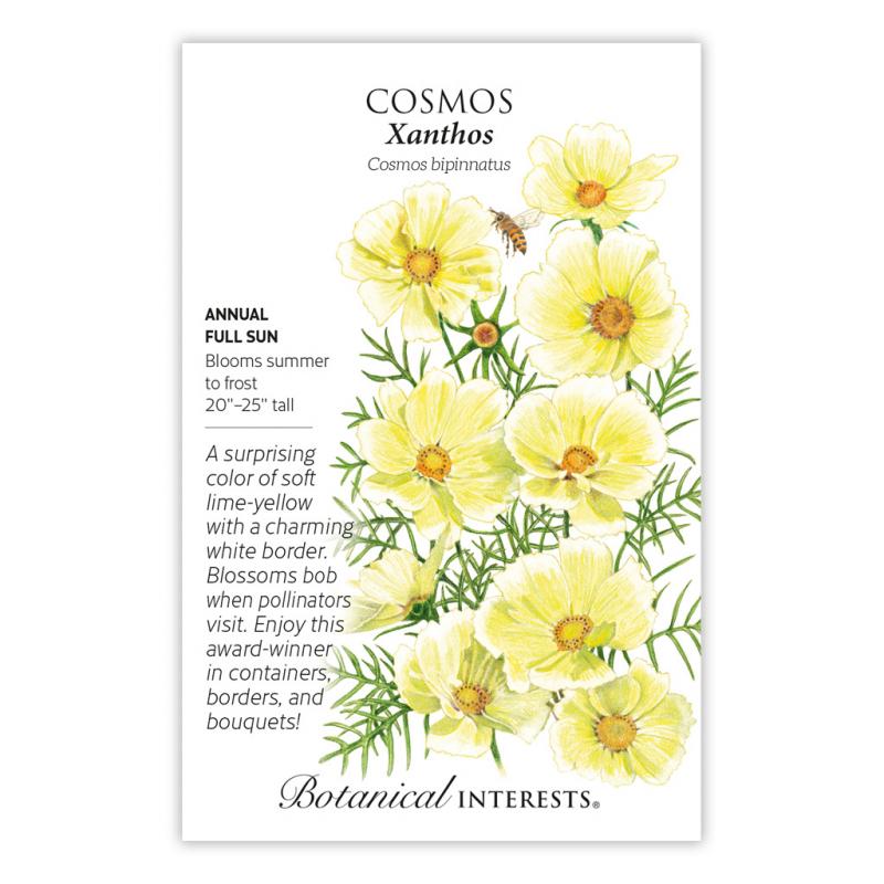 | An out-of-this-world color of cosmos! This fairly new, yellow beauty (xantho means "yellow" in Greek) won the Fleuroselect Novelty, and Gold Medal awards in 2016. Not only is the color unique, the plants are early to flower, well-branched, and shorter, making them an excellent choice for containers or borders. Cosmos are drought tolerant, practically care free, attract pollinators, and make a nice addition to a cut-flower bouquet. |