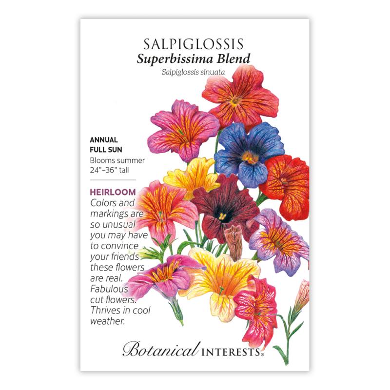 | Salpiglossis, also called painted tongue, has velvety flowers with metallic coloration and veination that has to be seen to be believed! A gardener in the early 1900s described them as having "bewildering combinations". Flowers beckon admirers to take a closer look, and are irresistible to butterflies. Performs best in cool weather. Excellent cut flowers. |
