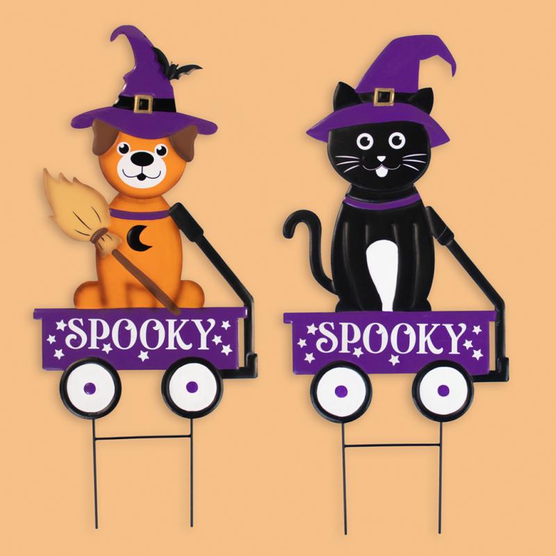 Metal skeleton stake 36 inches tall. Features of the stake is a skeleton with a top hat and "Happy Halloween" greeting.