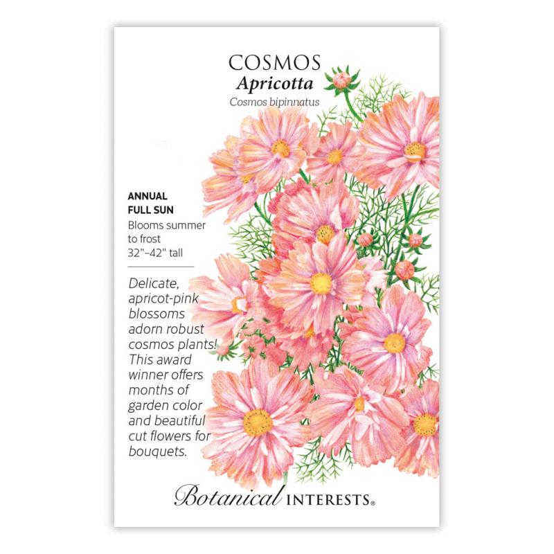 | Apricotta' is a 2021 Fleuroselect Novelty Award winner, and it's easy to see why. Cosmos are always a favorite for their cheerful bounty of blooms, and this color has us swooning! Stunning apricot-pink blooms with yellow centers atop sturdy, tall stems make them ideal for cutting. Cosmos attract pollinators, are drought-tolerant, and easy to care for. |