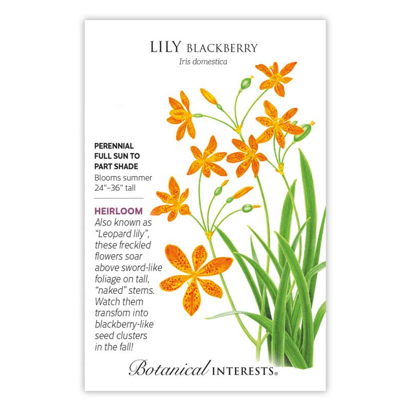 | This "lily" is actually a member of the iris family! "Iris" honors the Greek goddess of the rainbow, and these flowers add a perfect pop of color! Crimson-red spots cover the mostly orange petals, and fanned-out leaves and tall, clean stems make them ideal cut flowers. The seedheads split to reveal the namesake blackberry-like seedheads that also look lovely in in autumnal arrangements. Blackberry lilies are tough, drought-tolerant, and attract hummingbirds and other pollinators. Perennial in USDA zones 5 to 10. |