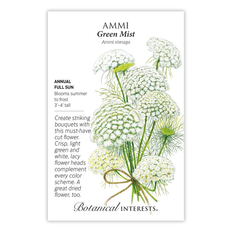 | A fabulous flower for mixed bouquets, the large, rounded umbels of 'Green Mist' start out a bold green, turning to white as the tiny flowers open. Also known as bishop's flower or false Queen Anne's lace, this practically care-free annual is an easy-to-manage addition to any garden, as it is fairly drought tolerant once established. Rich in nectar, it attracts beneficial insects. Take care when cutting, as the sap may irritate sensitive skin; wear gloves when harvesting or wash well after. |
