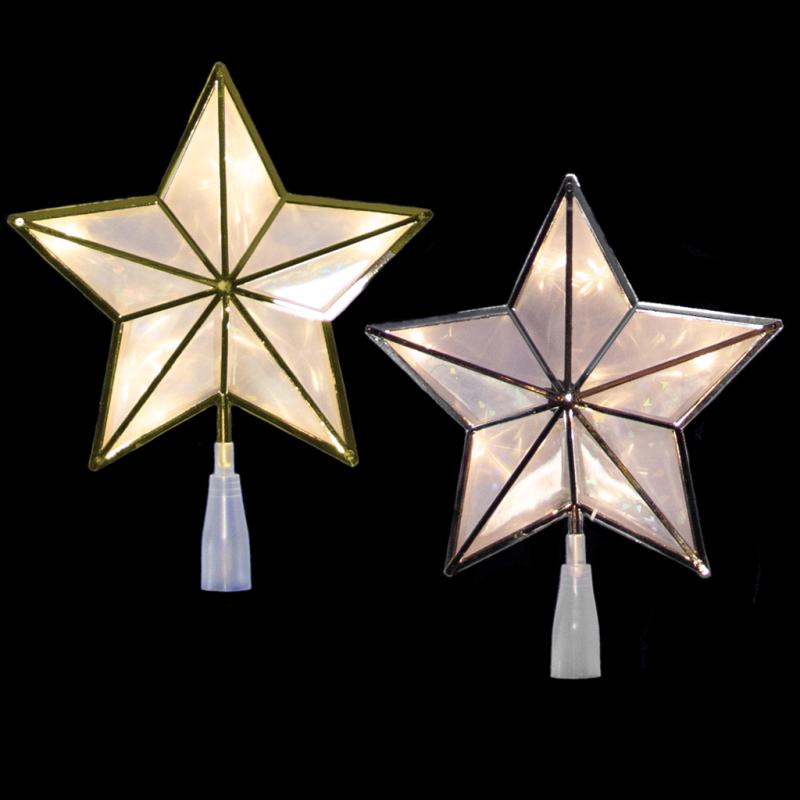 This11 inch Bethlehem star is a metal tree topper with 11 UL lights. That comes in silver glittered or gold glittered.