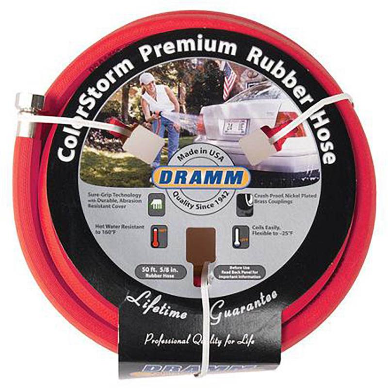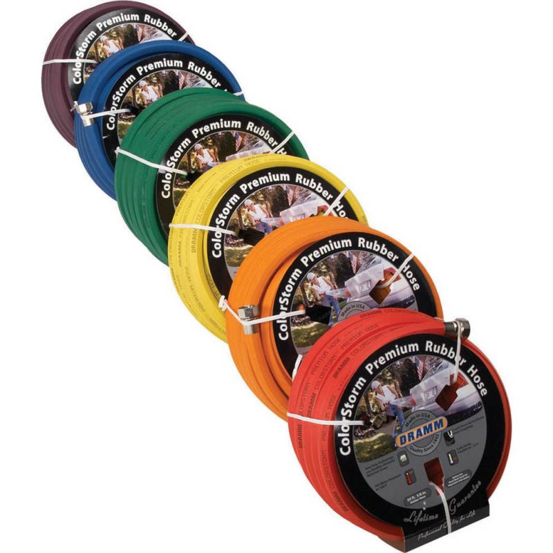 | Dramm ColorStorm™ premium rubber hose is made of EPDM rubber, this hose won't crack, check or separate. Sure-Grip™ technology resists kinking and coils easily, even in cold weather. Durable, abrasion resistant cover in six brilliant colors that will stand out in your yard. Professional quality for the home owner. Made in the U.S.A. with a lifetime guarantee to the consumer. |