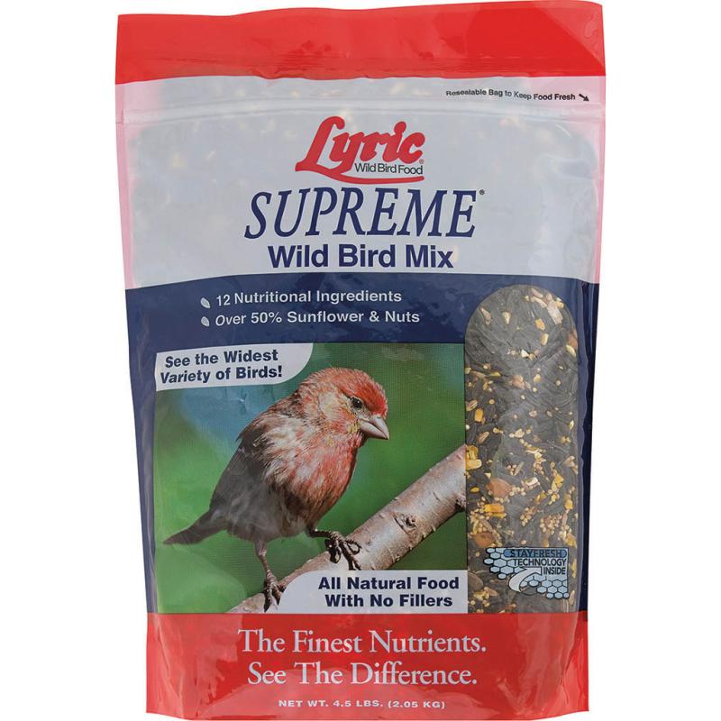 | Lyric Supreme Wild Bird Mix is full of all-natural, tested ingredients to attract a wide variety of colorful feeder birds. It contains black oil sunflower seed, white proso millet, cracked corn, shelled peanuts, safflower seed, black striped sunflower seed, pecans, pistachios, small golden millet seed, canary seed, Nyjer seed and sunflower kernels. |