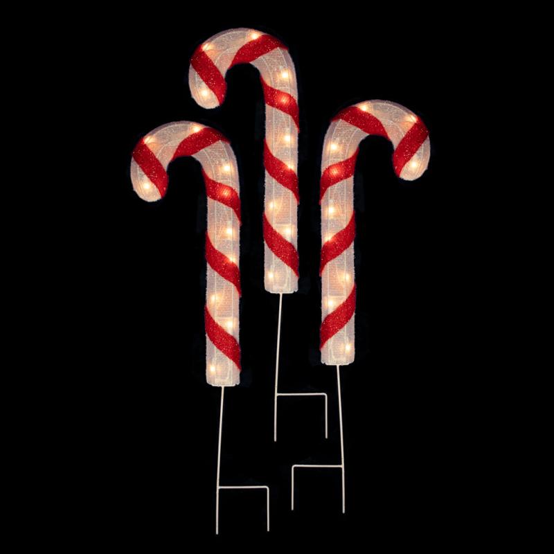 | These three-piece candy cane stakes are covered with sparkly outdoor fabric, red and white swirls, and are 20.5-inch lighted. They are illuminated with 30 UL clear lights total (10 lights each) with individual plugs that can be used Indoors, outdoors, or on a covered porch. |