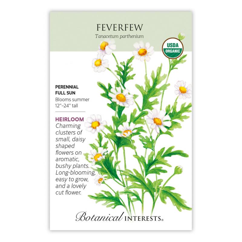 | A Victorian garden staple and an herbal remedy for centuries, feverfew is a reliable, fairly drought-tolerant, unfussy plant with masses of small white flowers on scented, ferny foliage. Blooms attract beneficial insects, and are great fresh-cut or dried flowers. Avidly reseeds, so let these "volunteers" decorate your garden and attract pollinators. Also known as featherfew, bachelor's or bride's button, and midsummer daisy. Feverfew is used in traditional teas and has a long history of medicinal use. Perennial in USDA zones 5–8. Deer resistant. |
