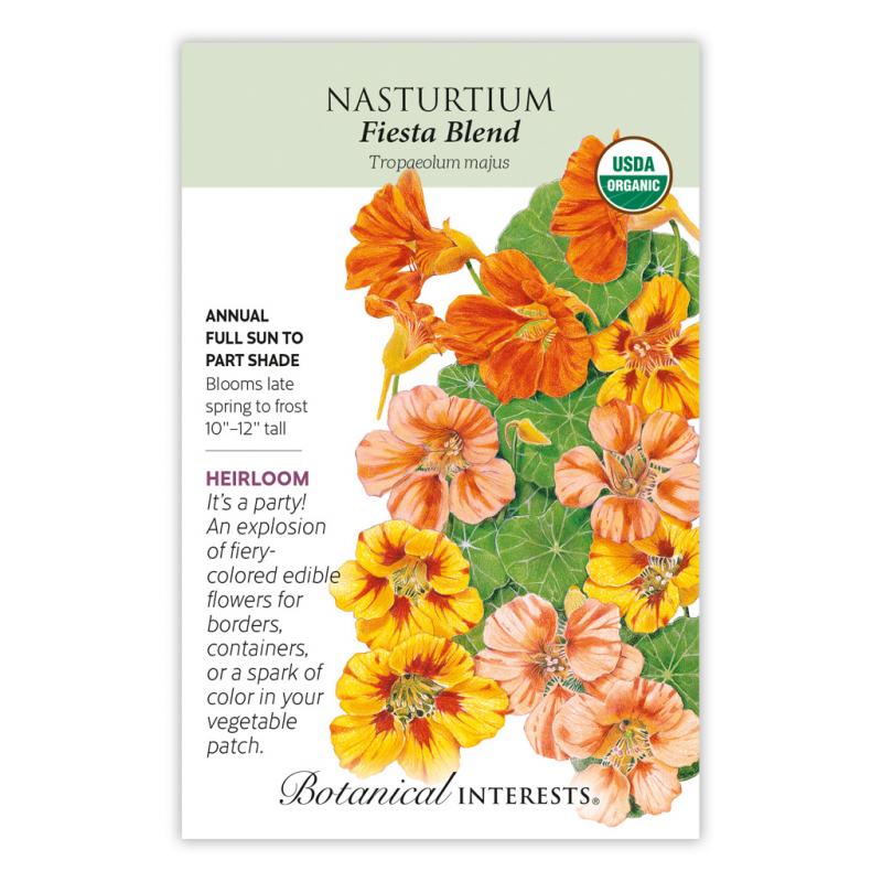 | Every salad should have edible nasturtium flowers. Fiesta Blend is a spicy feast of color with flowers in orange, yellow, and orange/peach bi-colors that brighten up hanging baskets and large containers. This beautiful plant is especially exquisite gracing a stone garden wall. The blossom petals are a festive addition to salads and pastas. Plant some in your vegetable patch to attract pollinators. Withstands coastal salty air. |