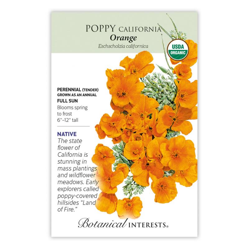 | Imagine what a sight it was for early explorers and settlers when they first laid eyes on the California hillsides massed with golden-orange flowers fluttering in the breeze. This drought-tolerant heirloom, the state flower of California, attracts pollinators and is an ideal plant for naturalized, wildflower areas. Reseeds readily. |