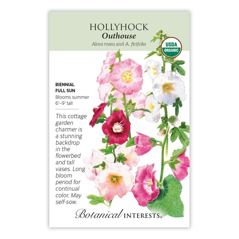 | Once called "outhouse flowers", stunning hollyhocks were grown around outhouses because hollyhocks were tall enough to cover them, and also as a signal to guests where they were located. This hollyhock has a long bloom period, too! Hollyhock flowers are edible, but very bland; however, the large, colorful petals are lovely garnishing salads or desserts. (The flower's central disk, while edible, can be bitter.) Fairly drought tolerant but performs best with ample moisture and rich soil; otherwise, practically care free. |