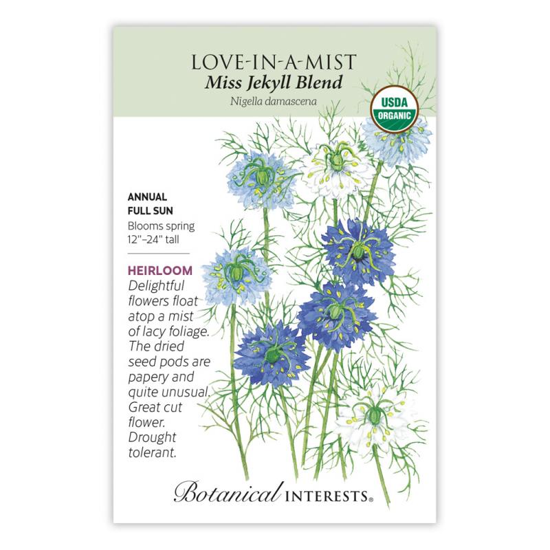 | Give your garden a cool, airy feel with Miss Jekyll Blend, a quick-to-bloom plant whose flowers attract pollinators, and look great both in the garden and in your bouquet. Interesting seed pods look appealing in dried arrangements, too. Named for Gertrude Jekyll, one of the most influential garden designers of the 20th century. Love-in-a-mist is drought tolerant, and self-sows readily to grace your garden year after year. |