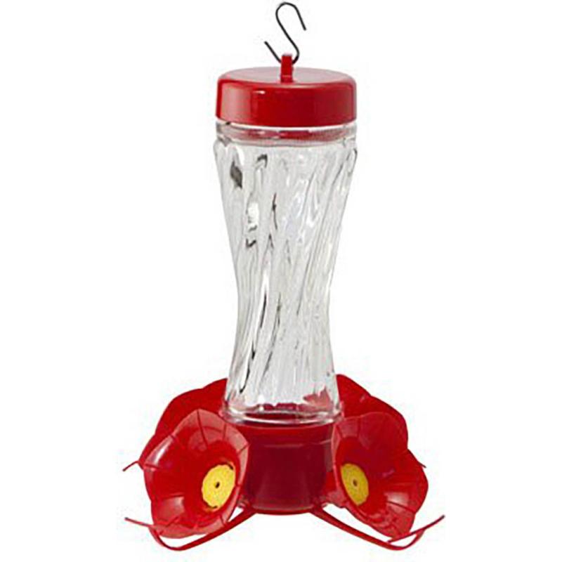 | The Audubon hummingbird feeder has a clear glass swirl bottle. Includes a decorative twist off base. No drip flowers with 4 swirling perches which makes it easy to fill and clean. |