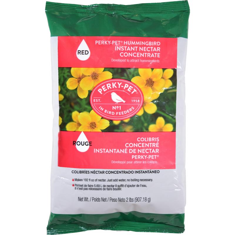 | The Perky-Pet Original Instant Nectar is made of 100% sucrose, which provides the highest amount of energy to hummingbirds. This hummingbird nectar concentrate is so easy to use- simply stir in water. No artificial color or sweeteners added. No boiling required. 8 oz. makes 48 oz. |