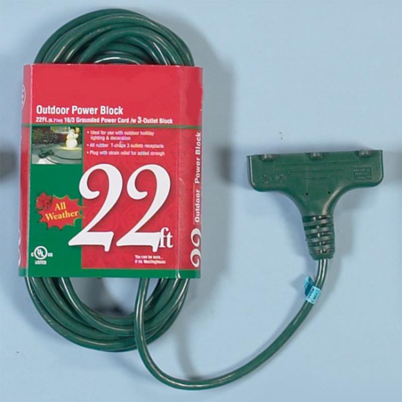 Description: This 22-foot 3-outlet tri-tap green UL extension cord is 16/3 SJT wire 13 amp, 125V, 1625W rated, grounded for use with 3-wire plugs and outlets, and has polarized security for proper alignment of hot and neutral wires. The double-insulated cord has a one-piece molded plug construction for extra durability and is excellent for outdoor use.