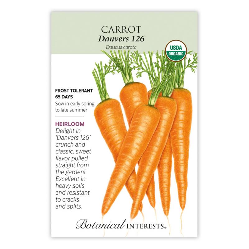 | Growers in Danvers, Massachusetts during the late-19th century were searching for a carrot with improved color, yield, and uniformity. After many variations, the 'Danvers 126' carrot was born! It grows particularly well interplanted with onions and in heavy soils due to its high fiber content. Heat-tolerant with high yields, it also has a noticeably sweeter flavor and stores exceptionally well if cleaned after harvest. Resistant to cracks and splits. |