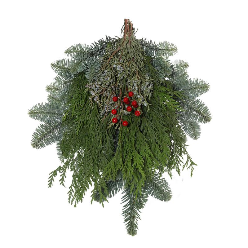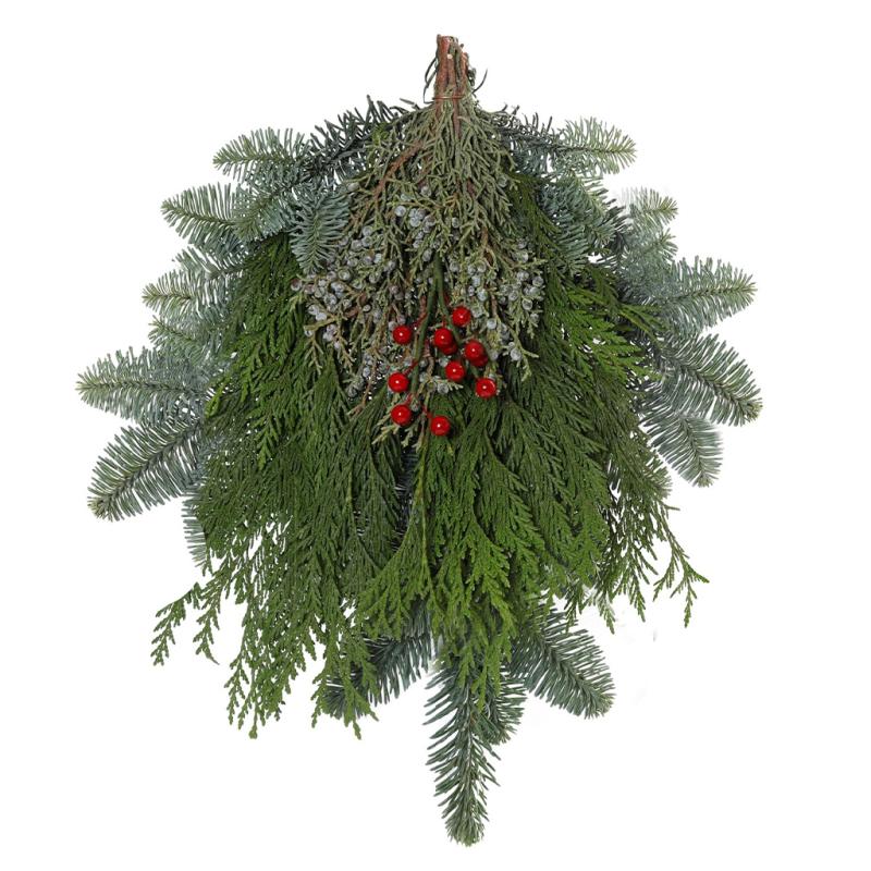 Description: The Value Swag is 9" Wide and 15" long. It is made with Noble Fir, Green Cedar, Oregon Blue Berried Juniper, and faux Redberries.