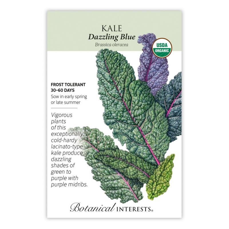 | Be dazzled by the striking colors of this extra-cold-hardy kale—more cold tolerant than other lacinato types. The striking purple midrib pops against the blue-green leaves, some of which may take on more purple hues in the cool temperatures of fall. Lacinato kale is ideal for kale salads and other fresh culinary endeavors. Pick tender, baby greens for fresh salads, chips, or cooking, in just 30 days. |