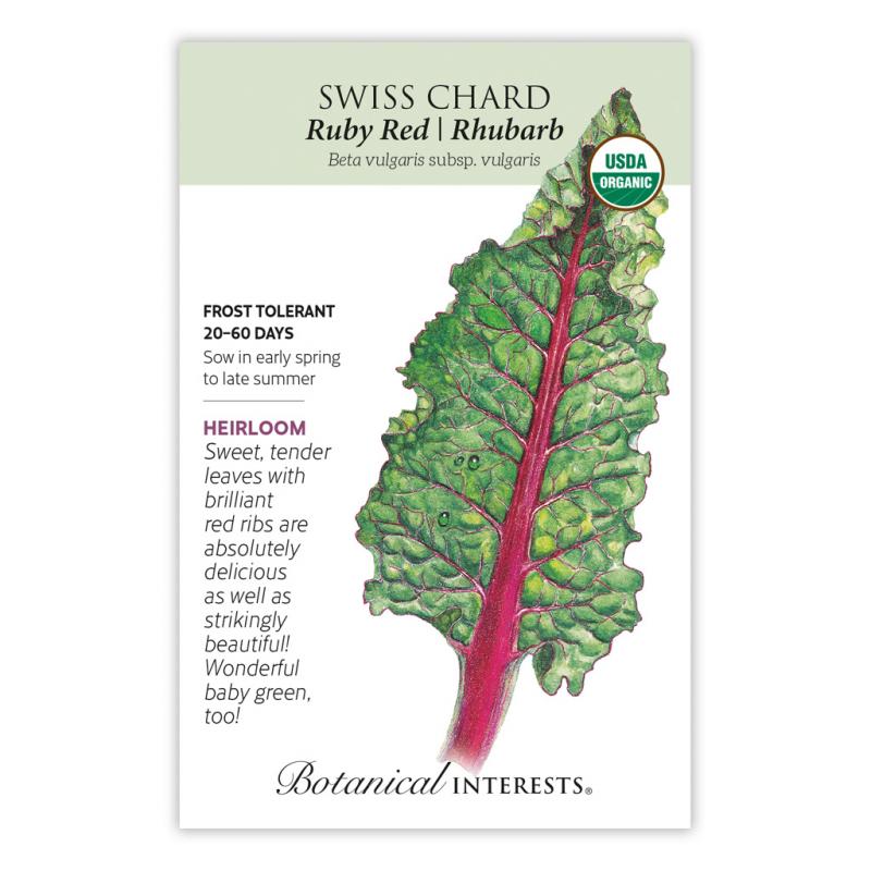 | Ruby Red' chard will beautify your garden as well as your plate! An 1850s vigorous grower with a long growing season, it will provide fresh greens from early summer into fall, and year-round in mild climates. Packed with vitamins and minerals, young leaves are great for salads. Any size leaves can be steamed, stir-fried, added to lasagna, omelets, soups, and stews, and mixed with other greens. Good container variety. |