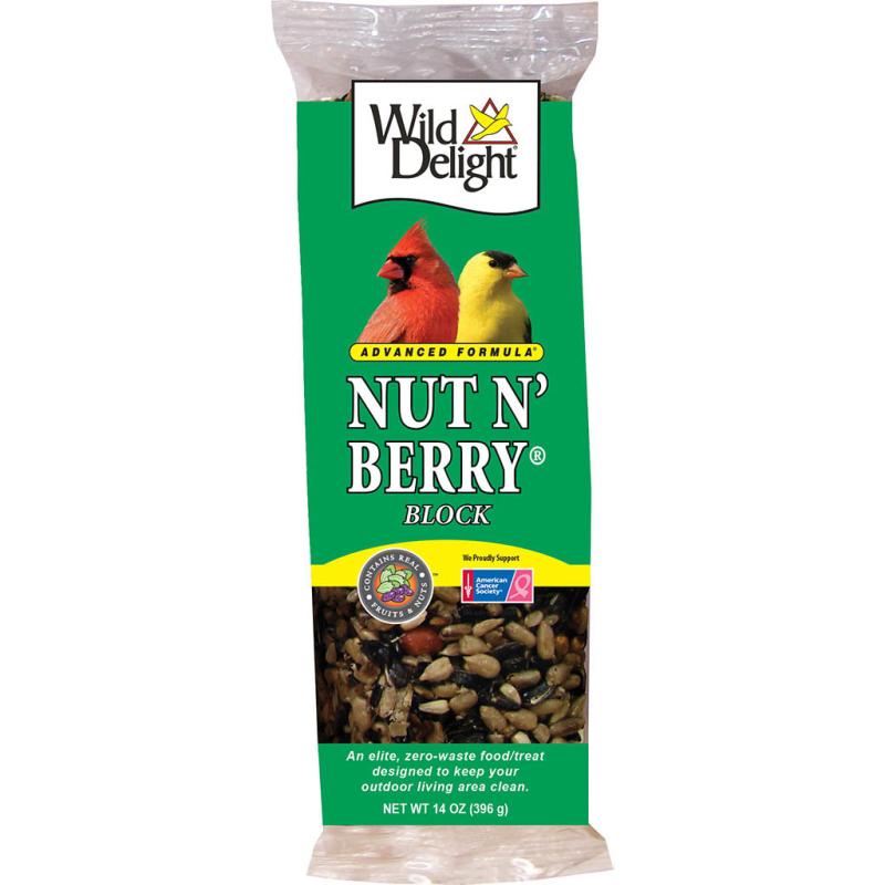 Description: Wild Delight Nut n' Berry Outdoor Pet Food Block is a nutritious formula containing real fruit and berries. It is ideal for songbirds, woodpeckers, cardinals, titmice, grosbeaks, nuthatches, chickadees, finches, jays, thrushes, buntings and other outdoor pets. 13 oz.