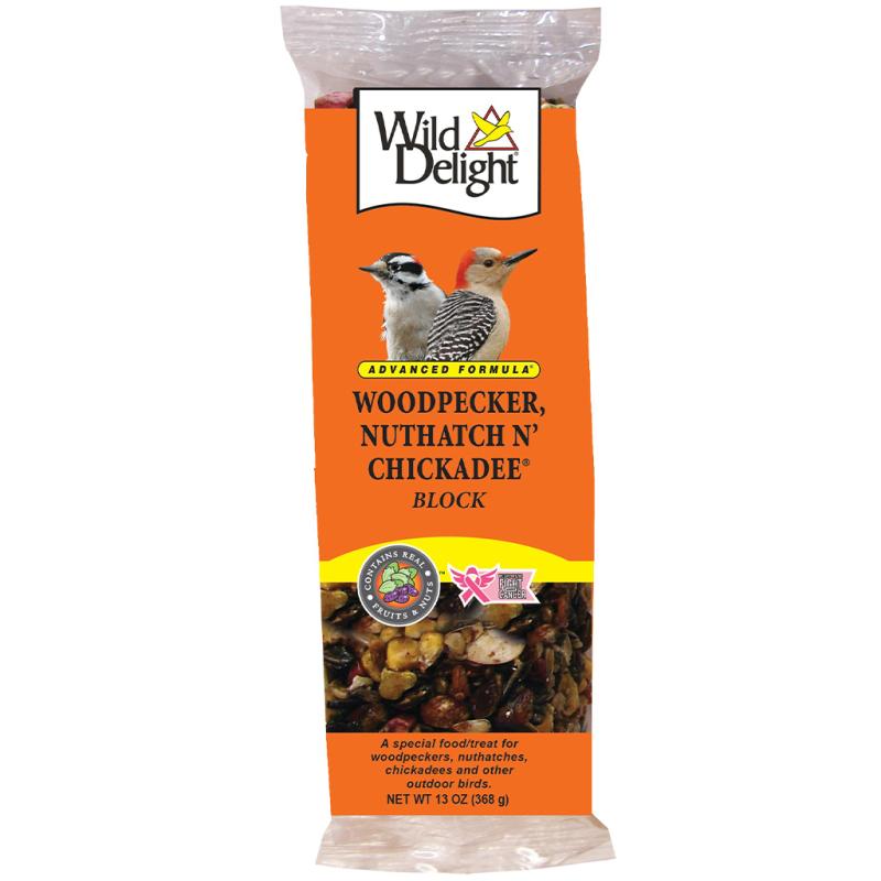 | A special, nutritionally fortified (with added supplement) food/treat for all woodpeckers, nuthatches, chickadees, cardinals, songbirds, and other outdoor pets. Features: real nuts, real fruit, vitamins, minerals, electrolytes, with no corn, milo, or millet. For use with Wild Delight® Block Feeder, or can be hung from a tree, a hook, or placed on the ground. |