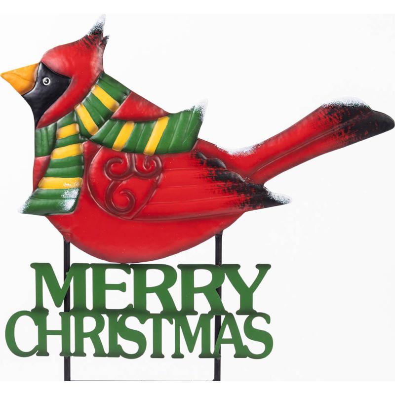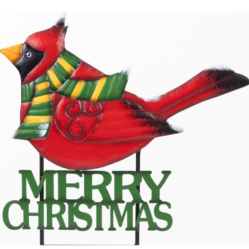 Metal cardinal with scarf stake with the words "Merry Christmas".