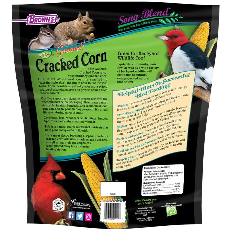 Brown’s® Gourmet Cracked Corn is not your ordinary cracked corn. Our select, all-natural corn is cracked to just the right size, making it easy for wild birds to eat. These consistently sized pieces are a prized source of essential energy and protein gained from starch and oils. Our unique five-stage cleaning process removes fine dust and dirt before packaging. This creates the most desirable, healthiest, most beneficial, and economical food you can add to your wild bird feeding program. It’s a real lifesaver during stressful times. Cardinals, jays, woodpeckers, buntings, juncos, sparrows, and nuthatches love cracked corn. It’s a natural source of essential vitamins A & C that help your backyard birds flourish. And Brown’s® Song Blend® is a great decoy! Providing a separate feeder of cracked corn will attract starlings, blackbirds, squirrels, and chipmunks when placed away from the main feeding station. Provide Song Blend® premium wild bird products and hear your backyard wild birds sing a happy tune! That’s because “Brown’s® is Better!” After carefully choosing only the best ingredients, our unique “Five-Stage Cleaning Process” removes unwanted foreign matter to provide the cleanest, most nutritionally healthy product available. Our “Packed-Fresh” packaging process and “Barrier Bags” protect the long-term freshness and quality of our product. Whether you’re a novice or hobbyist, you’re sure to find that Song Blend® products will make your wild bird feeding experience rewarding and fun!