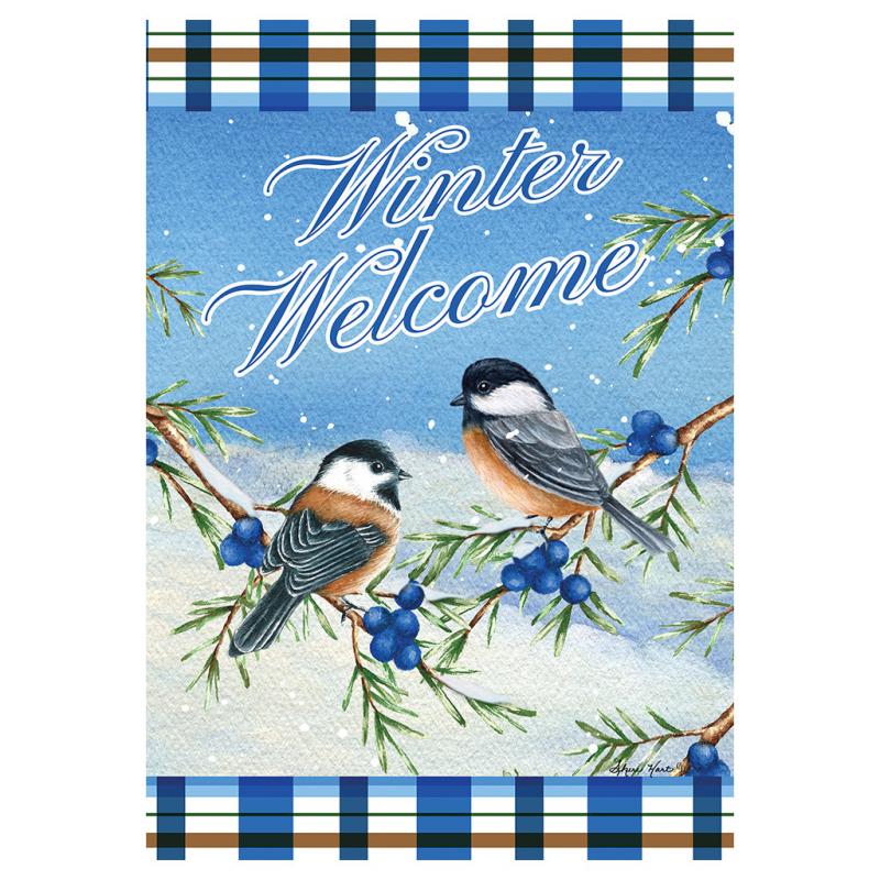 | This Welcome Winter Chickadees Large Home Flag from Custom Decor welcomes you in the season. It is one of their gorgeous double-sided flags, proudly printed here, in-house in the USA! Each flag is printed using fade-resistant ink on luxurious, velvety, soft, heavyweight fabric, creating a beautiful drape showcasing its stunning design. |