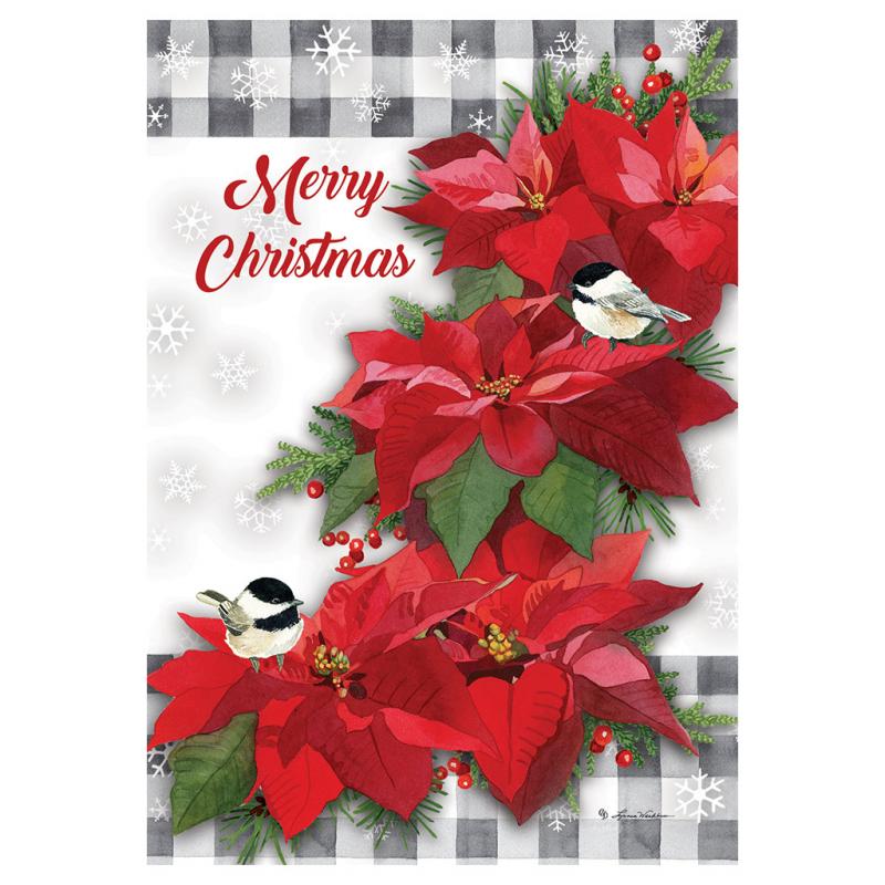 Description: This Poinsettia Christmas Large Home Flag from Custom Decor welcomes you in the season. It is one of their gorgeous double-sided flags, proudly printed here, in-house in the USA! Each flag is printed using fade-resistant ink on luxurious, velvety, soft, heavyweight fabric, creating a beautiful drape showcasing its stunning design.