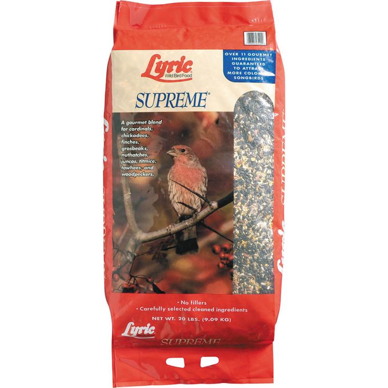 | Lyric Supreme Wild Bird Mix is full of all-natural, tested ingredients to attract a wide variety of colorful feeder birds. It contains black oil sunflower seed, white proso millet, cracked corn, shelled peanuts, safflower seed, black striped sunflower seed, pecans, pistachios, small golden millet seed, canary seed, Nyjer seed and sunflower kernels. |