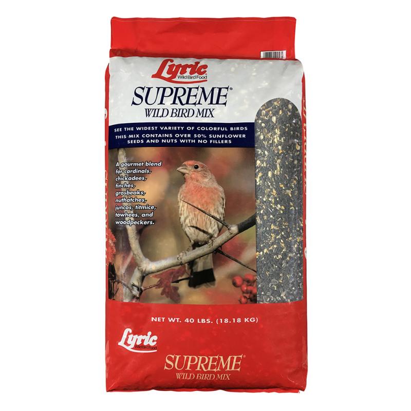 | Lyric Supreme Wild Bird Mix is full of all-natural, tested ingredients to attract a wide variety of colorful feeder birds. It contains black oil sunflower seed, white proso millet, cracked corn, shelled peanuts, safflower seed, black striped sunflower seed, pecans, pistachios, small golden millet seed, canary seed, Nyjer seed and sunflower kernels. |