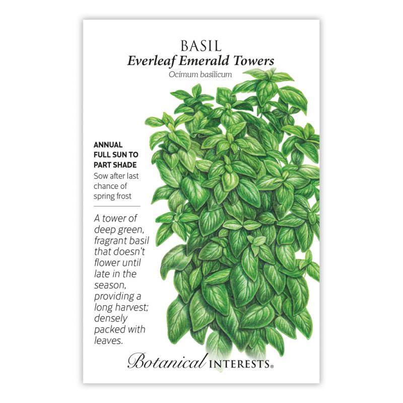 | Pretty enough to be the centerpiece of your patio flowerpot, 'Everleaf Emerald Towers' is true to its name: prolific in leaf growth; deep, emerald, glossy green leaves; and forms an herbal tower. This cultivar holds off flower production up to 12 weeks longer than other types of basil, so you don't have to worry about pinching flowers off to keep your basil producing tender leaves. |