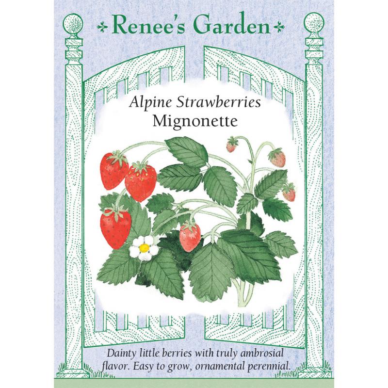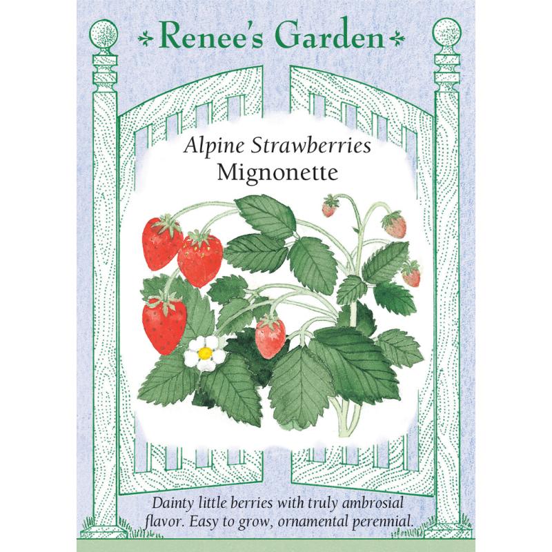 | A French delicacy. Our improved cultivar of heirloom Reine de Vallée produces dainty little pointed red berries with an ambrosial woodland flavor. Mignonette forms compact perennial plants that grow in pretty leafy mounds and produce fruits the first summer from seed to enjoy all season long. These special petite berries are lovely as a border edging or in containers, or plant them in hanging pots so you can pluck their exquisite little fruits as you stroll past. |
