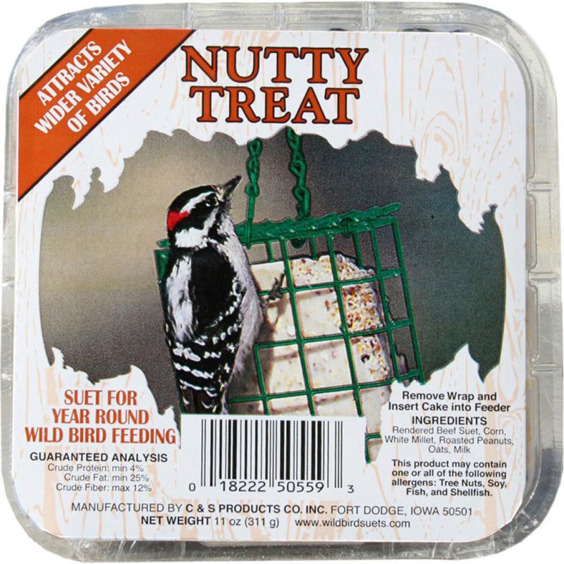Description: Nutty Treat Suet contains rendered beef suet, corn, white millet, roasted peanuts and oats. Treats will become soft and pliable at 100 degrees if exposed to extreme heat. They will return to normal hardness at room temperature. For year round wild bird feeding.