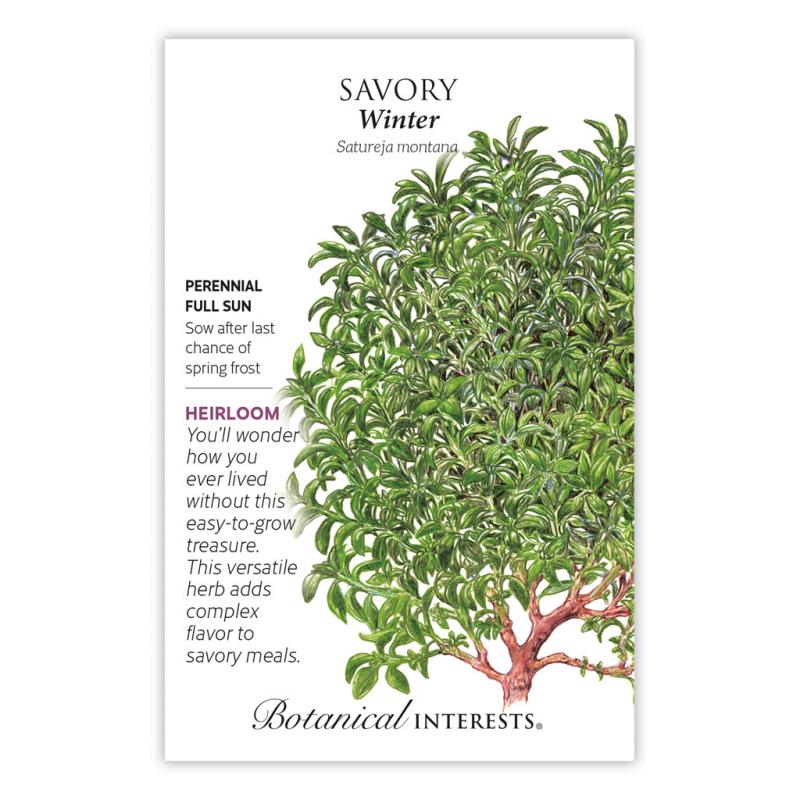 | Winter savory captures the best qualities of many herbs in one. Spicy and peppery with a hint of thyme and mint, this complex seasoning is especially delicious in rich, savory dishes. An attractive ornamental in rock gardens and borders, it beckons bees and other beneficial insects, and is a low-maintenance herb that grows well in poor soils. |