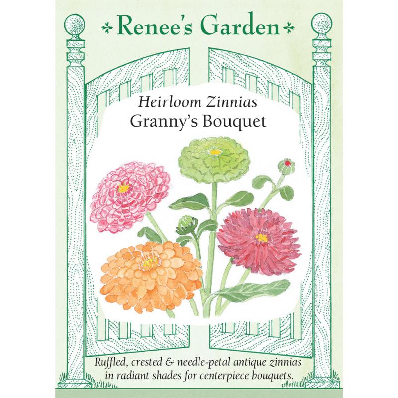 | (Zinnia elegans) This carefree mix of hard-to-find varieties has different flower forms. Enjoy antique bicolor-splashed “Carousel,” exotic needle-petal “Cactus,” chartreuse ruffled “Envy,” and free-blooming starry crested “California Giant.” This charming collage comes in all the radiant zinnia shades, including orange, scarlet, cherry, violet, rose, salmon, cream, gold, yellow, and chartreuse. These easy-to-grow and rewarding old-fashioned favorites are perfect for long-blooming borders and centerpiece bouquets. |