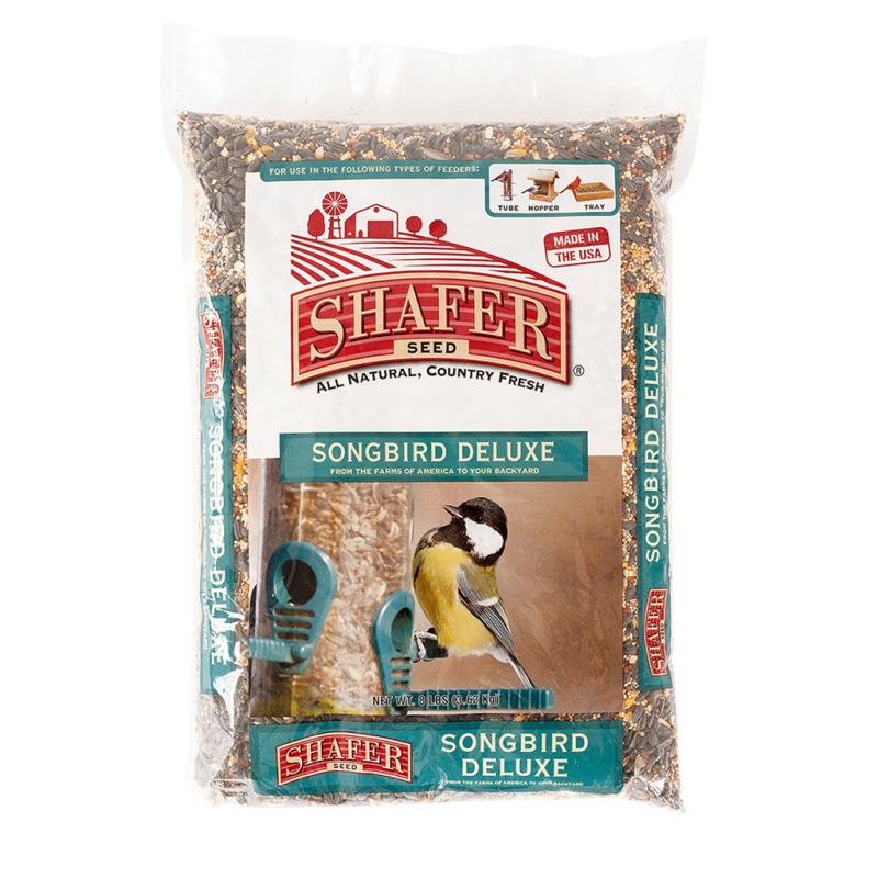 Description: Shafer Seed's Songbird Deluxe blend with 20% Sunflower and premium seeds offers the backyard bird enthusiast a moderately-priced food that is the real deal! Songbird Deluxe can be used in all types of feeders as well as being a great mix to attract those wonderful ground feeding birds. You’ll get all the regular customers like Cardinals, Chickadees and Finches as well as other indigenous backyard visitors.