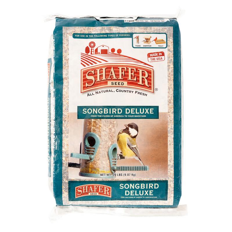 | Shafer Seed's Songbird Deluxe blend with 20% Sunflower and premium seeds offers the backyard bird enthusiast a moderately-priced food that is the real deal! Songbird Deluxe can be used in all types of feeders as well as being a great mix to attract those wonderful ground feeding birds. You’ll get all the regular customers like Cardinals, Chickadees and Finches as well as other indigenous backyard visitors. | |