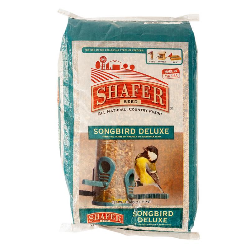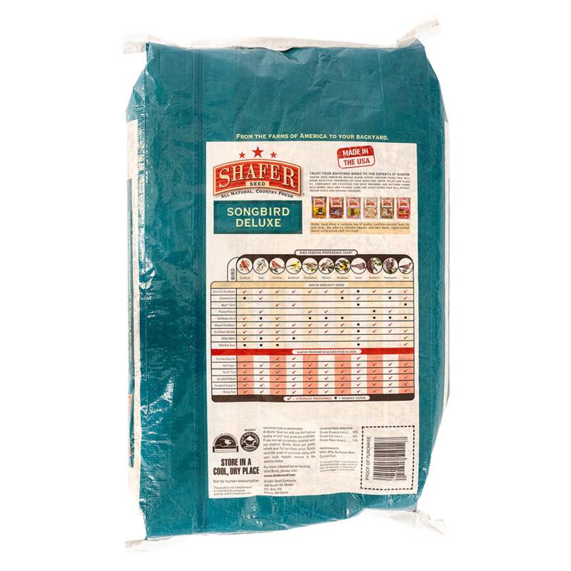 Description: Shafer Seed's Songbird Deluxe blend with 20% Sunflower and premium seeds offers the backyard bird enthusiast a moderately-priced food that is the real deal! Songbird Deluxe can be used in all types of feeders as well as being a great mix to attract those wonderful ground feeding birds. You’ll get all the regular customers like Cardinals, Chickadees and Finches as well as other indigenous backyard visitors.