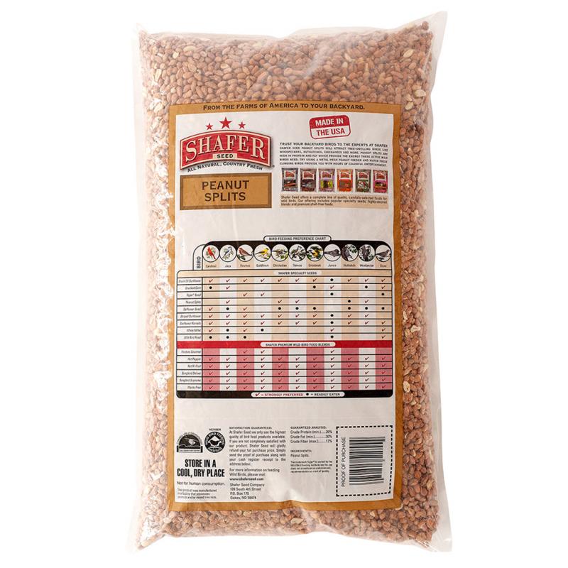 | Shafer Seed's Peanut Splits are a protein-packed delicacy for your favorite Songbirds. Peanut Splits give your backyard birds the calories they need for their busy daily activities. Peanut Splits are a favorite of Chickadees, Titmice, Nuthatches, Blue Jays and Grosbeaks. Great in mesh, platform and hopper feeders. | |