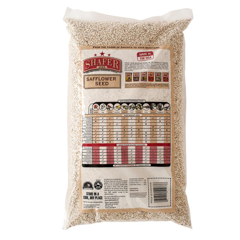 | Safflower Seed is a great seed to use to attract the birds you want - Cardinals, Chickadees, Titmice, and Grosbeaks - and at the same time discourage the “feeder hogs” like Grackles and Starlings that keep smaller birds away. And best of all, most squirrels don’t like the bitter taste so they will stay away as well. If you have unwanted birds & squirrels crowding out your Songbirds, temporarily fill your feeder with Safflower Seed for a few days until you see fewer nuisance visitors -- then gradually mix in your favorite Shafer Seed wild bird food. Shafer Seed's Safflower Seed is truly a premium, high value seed not found in ordinary blends. So give the Cardinals their favorite seed and keep the pests away at the same time, with Shafer Seed Safflower Seed. | |