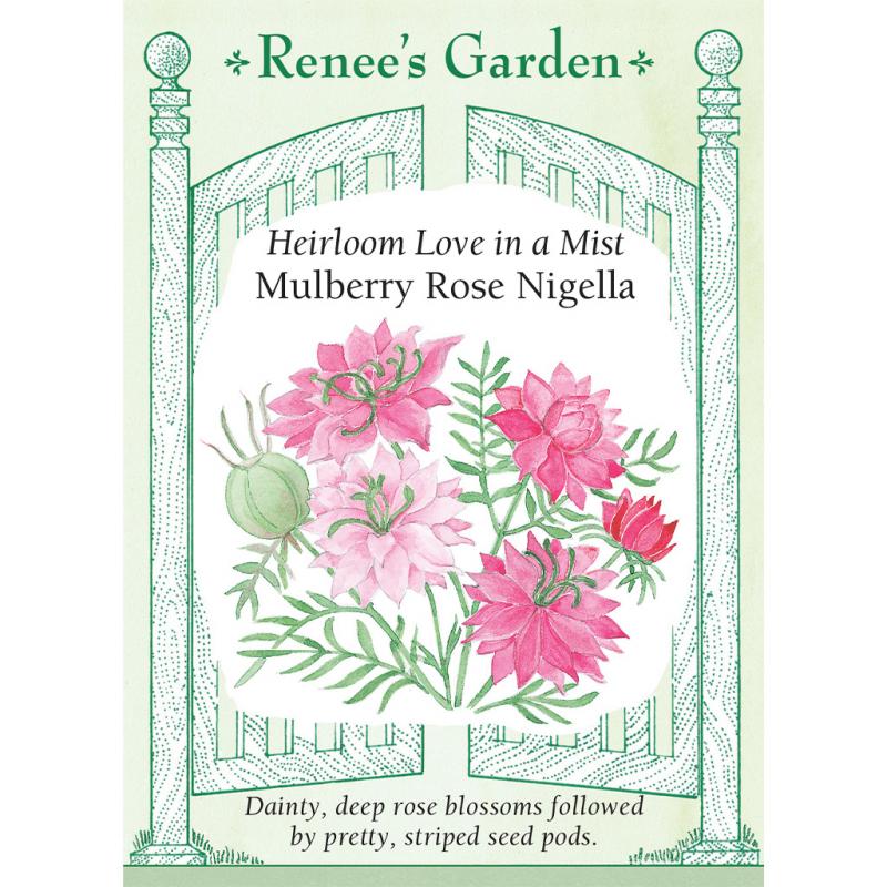 | (Nigella damascena) Rose Nigella, also called Love in a Mist, has dainty multifaceted blossoms that open pastel pink, then deepen to an enchanting deep rose. The delicate flowers make charming petite bouquets. Once petals drop, blossoms are transformed into little fairy lanterns and the mature striped seed pods are among the prettiest of dried everlastings. This effortless and easy to grow annual is the very essence of a classic English cottage garden, yet it is adaptable to all climates. |