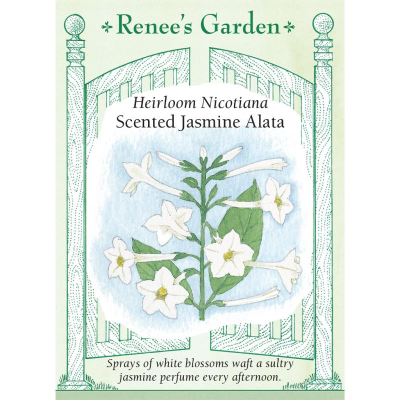 | (Nicotiana alata) Sweetly scented old-fashioned Nicotiana grows into 3 to 4 foot, broad leafed plants with graceful sprays of white tubular blossoms. Their sultry jasmine perfume drifts through the air in the late afternoon and evening. These exotic tropical looking South American natives can handle both heat and humidity as well as cooler conditions. You’ll find their nostalgic grace and wafting fragrance a joy to be near in the moonlight. |