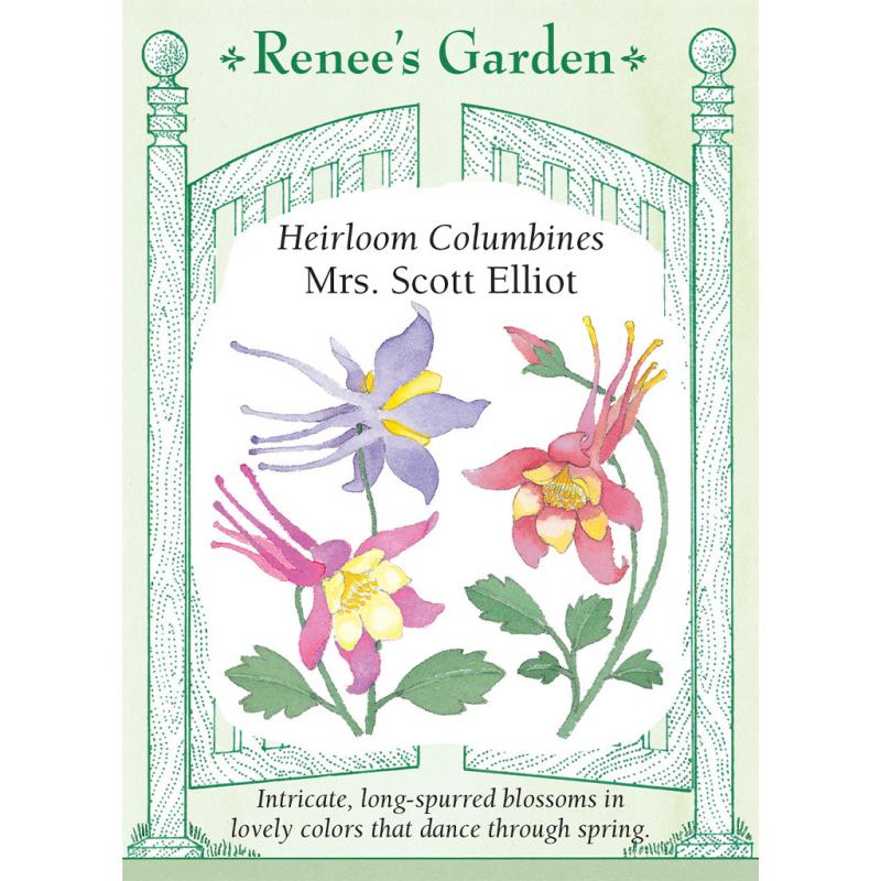 Description: Mrs. Scott Elliot Columbine is imported from France, where an old farm still grows seed for these old-fashioned beauties. Their large, elegant blossoms sway on wand-like stems above a cloud of lacy, scalloped green foliage. The intricate flowers, with their long, graceful spurs, are quite magical as they dance in combinations of white with pink, dark lavender, yellow, rose, claret, and pale blue. Mrs. Scott Elliot is one of my favorite joys of spring, and hummingbirds love them, too!