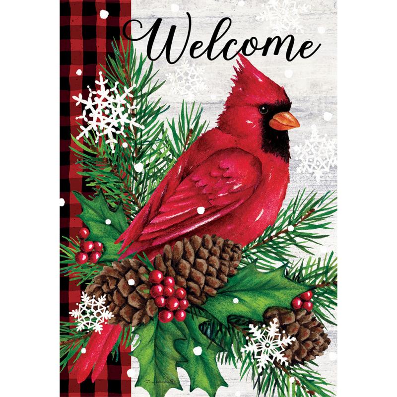 Description: This Welcome Cardinal Large Home Flag from Custom Decor welcomes you in the season. It is one of their gorgeous double-sided flags, proudly printed here, in-house, in the USA! Each flag is printed using fade-resistant ink on luxurious, velvety, soft, heavyweight fabric, creating a beautiful drape showcasing its stunning design.