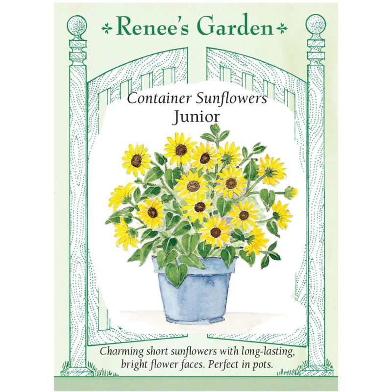 | (Helianthus annuus) Our favorite dwarf multi-blossoming sunflower, Junior forms ornamental rosettes of leaves even before flowering. When they burst into bloom, the cheerful, bright yellow 4 to 5 inch flower faces smile atop branching stalks just 2. feet tall. Eye-catching Junior sunflowers are long lasting and perfect to fill large pots and planters. They also make a great edging for a summer vegetable garden or flower bed. |
