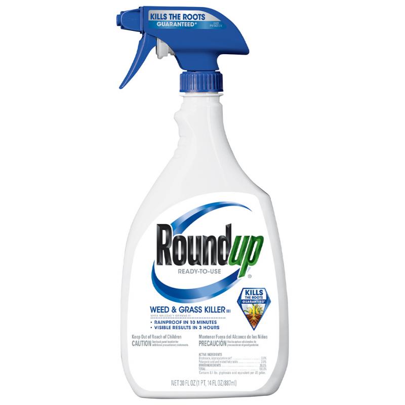 | Roundup Weed And Grass Killer kills the toughest weeds and grasses to the root, guaranteed. Convenient, no-mix formula can be used in and around vegetable gardens, flower beds, tree rings and mulched beds, as well as in driveways, walkways and patios. Rain proof in ten minutes. Visible results in 3 hours. Active ingredients: 2% Glyphosate; 2% Pelargonic acid, and related fatty acids. |