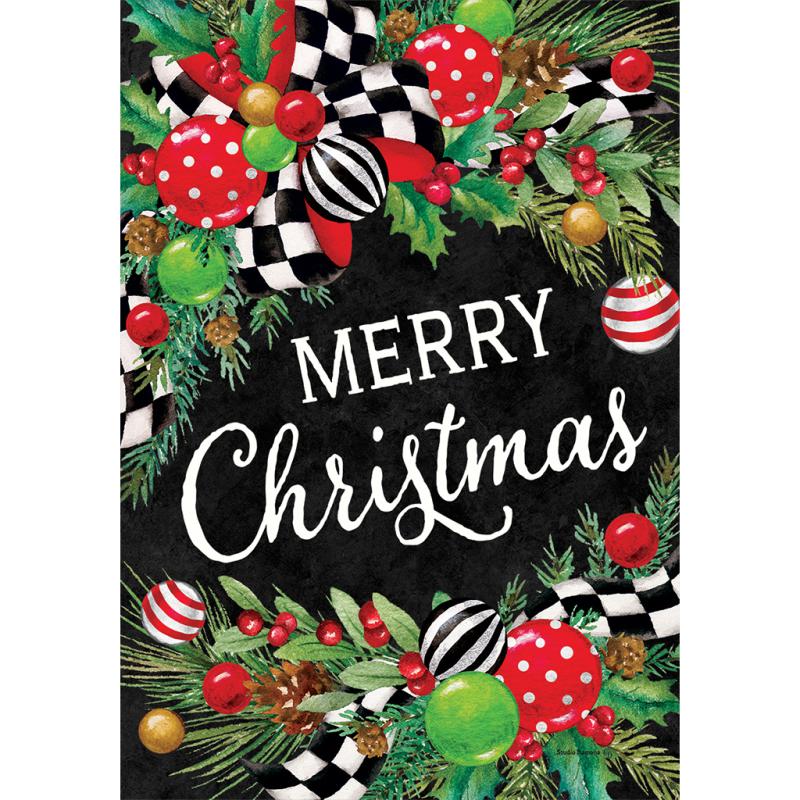 | This Merry Christmas Swag Large Home Flag from Custom Decor welcomes you in the season. It is one of their gorgeous double-sided flags, proudly printed here, in-house in the USA! Each flag is printed using fade-resistant ink on luxurious, velvety, soft, heavyweight fabric, creating a beautiful drape showcasing its stunning design. |