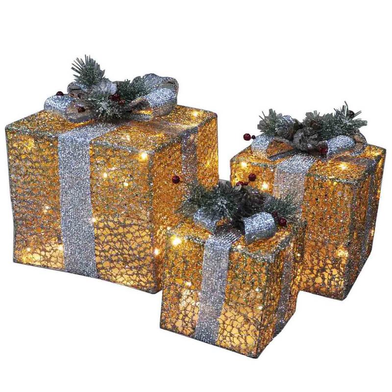 Set of three, 2-tone gold glittering net fabric gift boxes. For indoor and outdoor use. Adorned with silver ribbons, pine branches, pine cones, and berries. With 70 warm white LEDs and includes 7 LEDs with a twinkling effect.